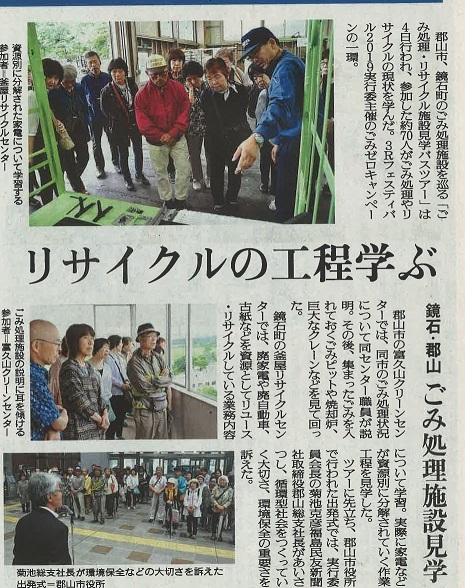 7月4日に郡山市、鏡石町のごみ処理施設を巡る「ごみ処理・リサイクル施設見学バスツアー」が行われ、約70人が当社リサイクルセンターを見学されました。廃家電・廃自動車が資源別に分解されていく作業工程を見学し、リサイクルの大切さについて学習されました。