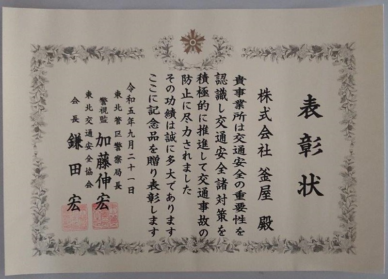 12月15日(金)に行われた第40回須賀川・岩瀬地方交通安全大会にて、東北管区警察局長・東北交通安全協会会長連名表彰の「優良交通安全事業所」として表彰されました。