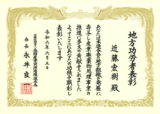 弊社社長が、地方功労者として全国産業資源循環連合会会長より表彰状をいただきました。