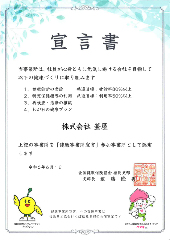 協会けんぽ福島支部「健康事業所宣言」参加事業所に認定されました。