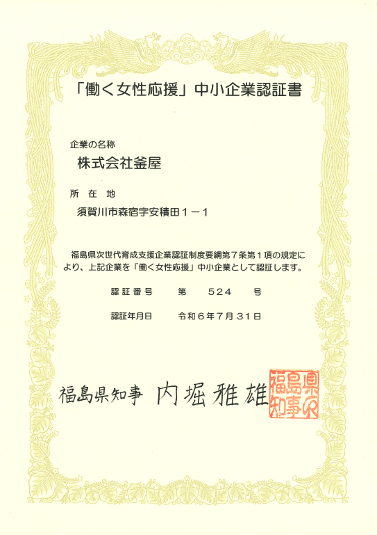 福島県次世代育成支援企業認定制度「働く女性応援」中小企業に認定されました。