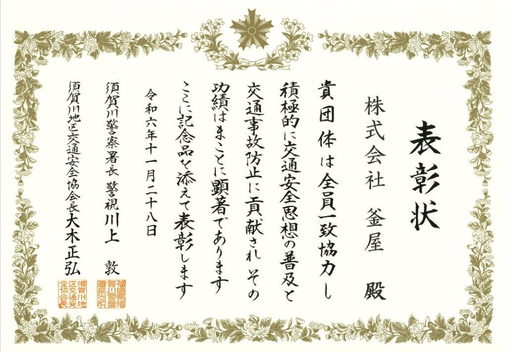 交通安全思想の普及と交通事故防止に貢献したとされ、表彰状をいただきました。