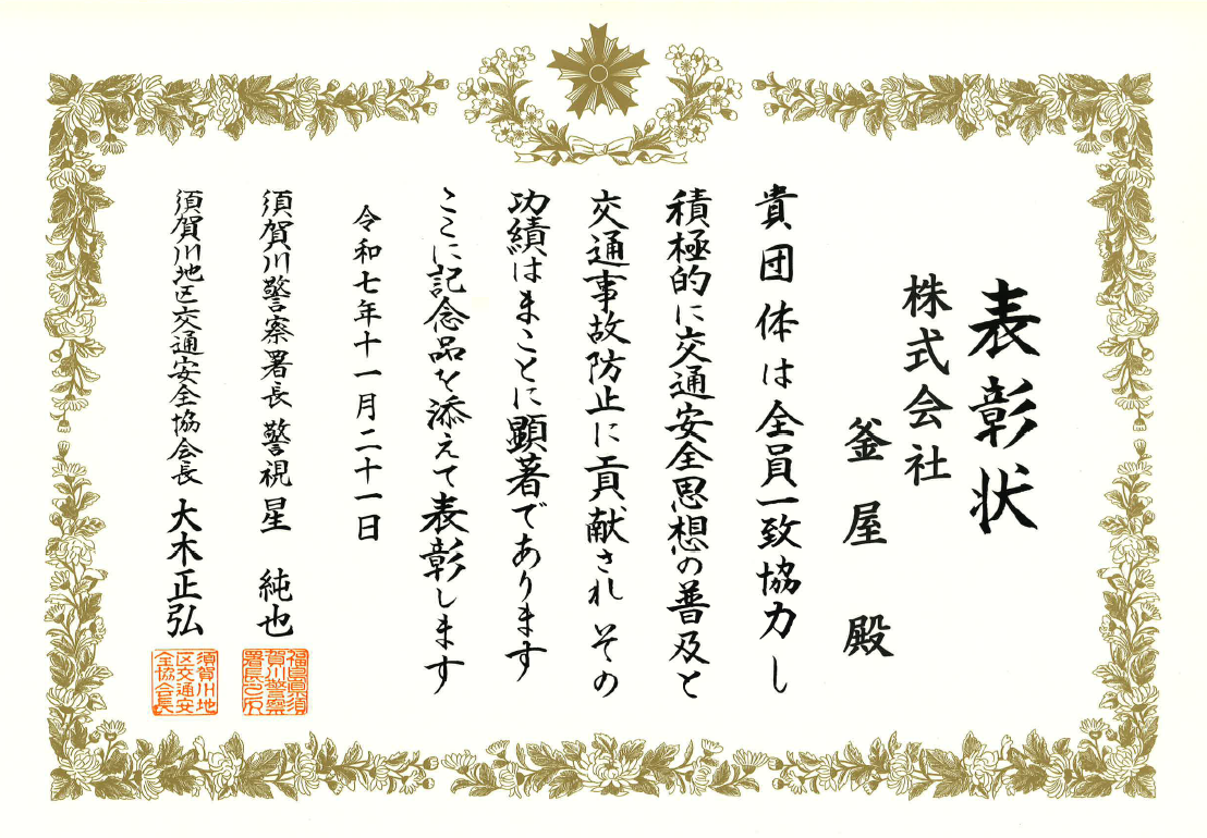 11月21日(金)に行われた第42回須賀川・岩瀬地方交通安全大会にて、須賀川警察署長・須賀川地区交通安全協会長連名表彰の「優良交通安全活動団体」として表彰されました。