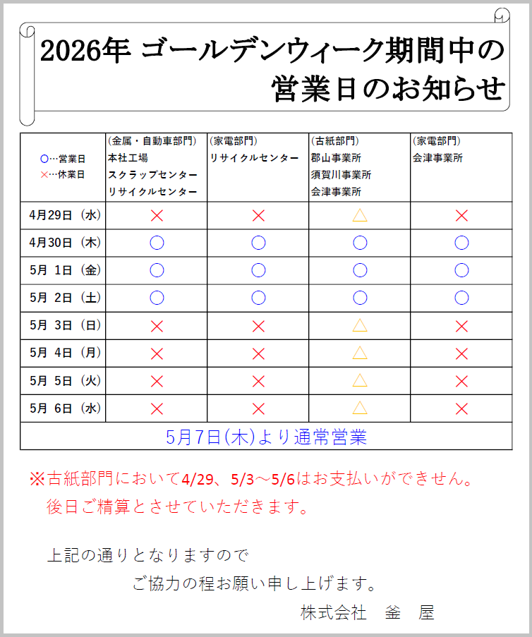 古紙リサイクル部門(郡山、須賀川、会津)は無休で営業しておりますが、お支払いに一部制限がございます。