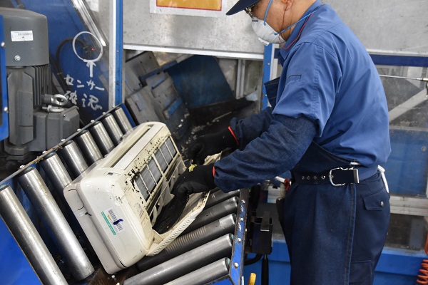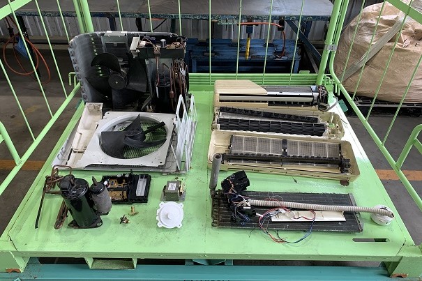 室内機・室外機を解体し、熱交換器や基板、銅、モーターなどを回収します。室外機からはオゾン層を破壊するフロンガスを回収します。