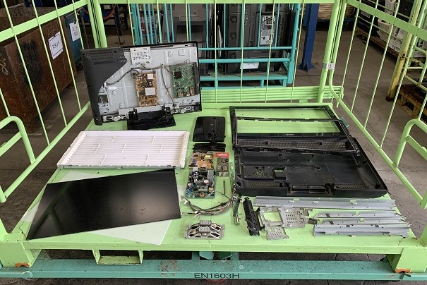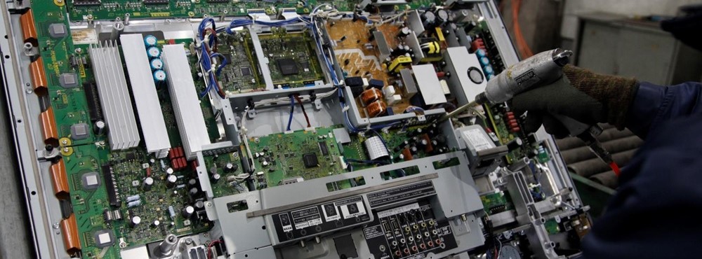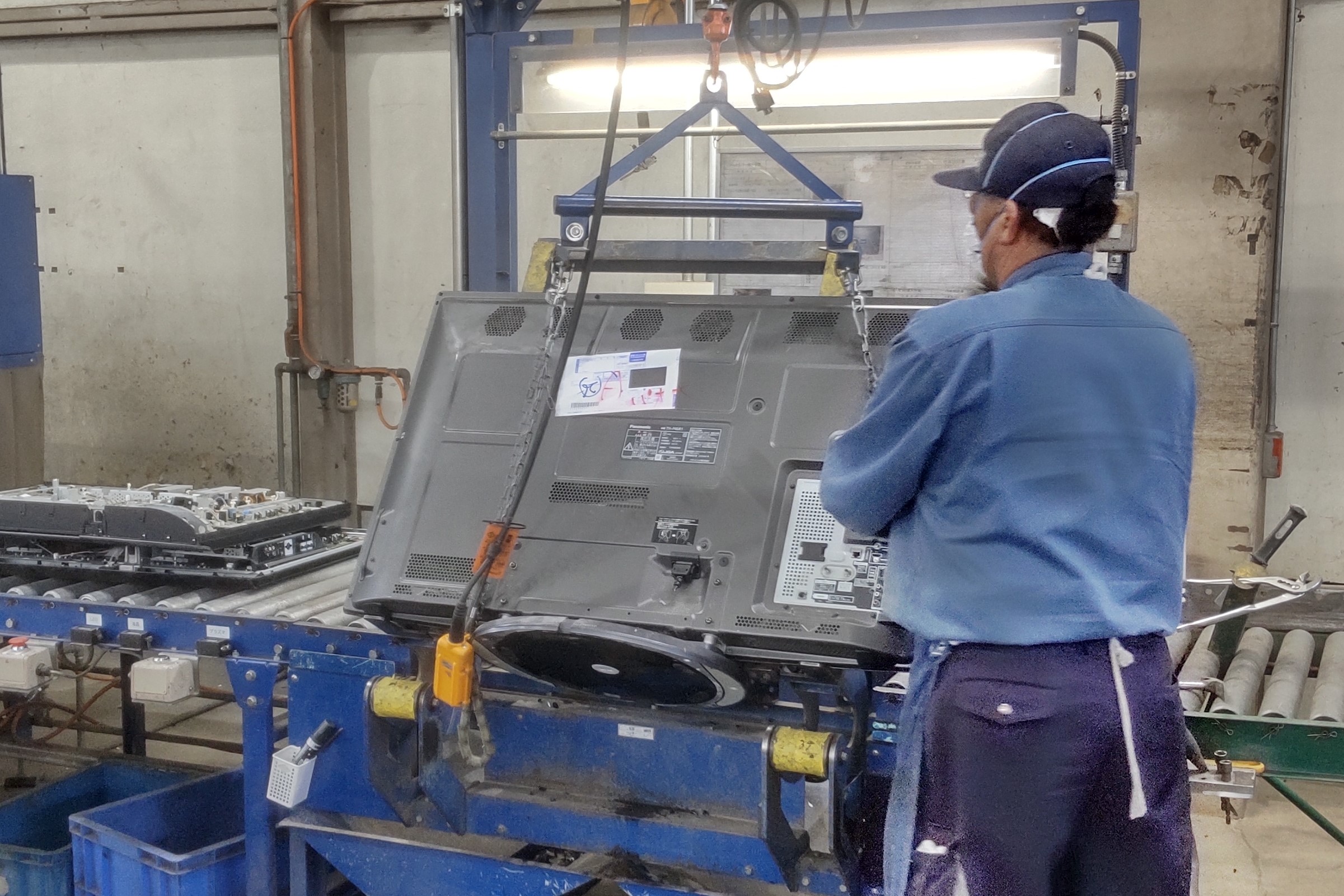 薄型テレビ、ブラウン管テレビを解体し、銅線や基板を回収します。
