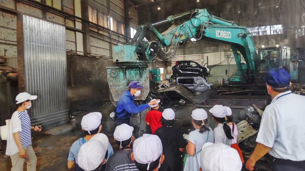 7月11日に須賀川市立小塩江小学校の3・4年生の皆さん10名が、学習旅行の一環で当社リサイクルセンターに来社されました。廃家電・廃自動車のリサイクル工程を熱心に勉強していました。