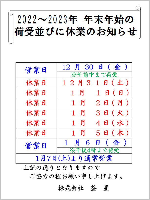 本社工場、スクラップセンター、リサイクルセンターの営業日をご案内申し上げます。