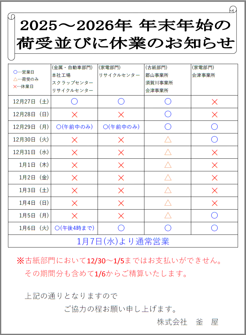 古紙リサイクル部門(郡山、須賀川、会津)は無休で営業しておりますが、お支払いに一部制限がございます。